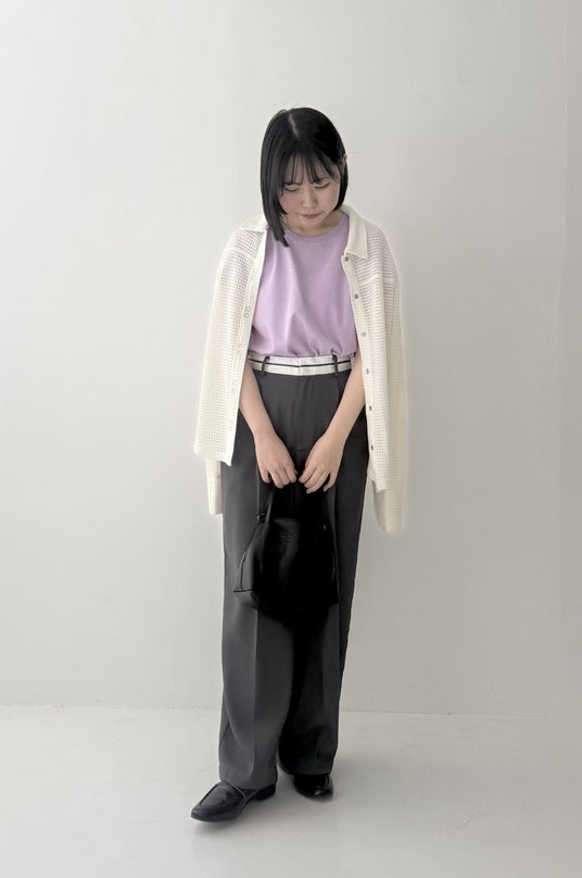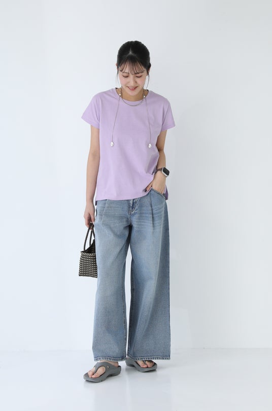 可愛らしい印象になりがちなラベンダーのTシャツも、スラックスのようなきれいめアイテムと合わせることで、甘さを抑えつつ女性らしさを引き立てます。ラベンダーの柔らかな色味が、スラックスのきちんと感に抜け感をプラスし、大人な着こなしに。