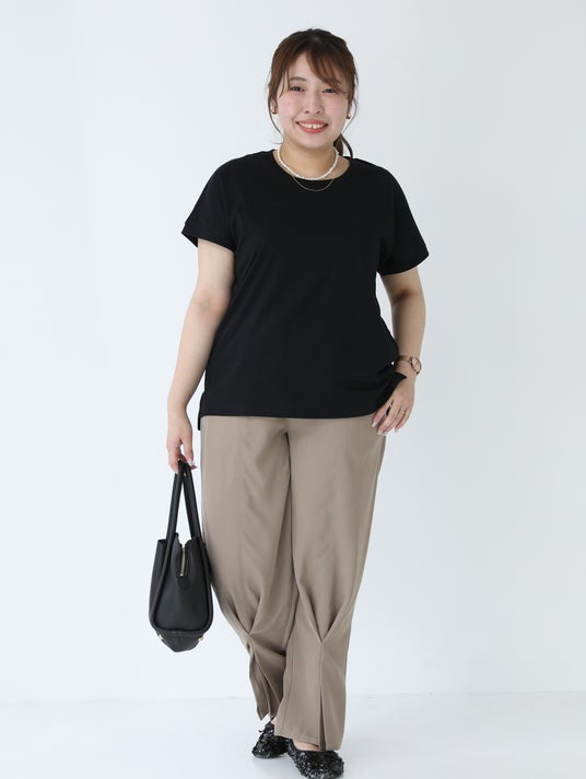 オフィスカジュアルスタイルにも取り入れやすいブラックTシャツは、タックデザインのパンツと合わせることで、落ち着いた大人の印象に。シンプルな組み合わせながらも、きちんと感をプラスしオフィスにも馴染むスタイリングに仕上がります。