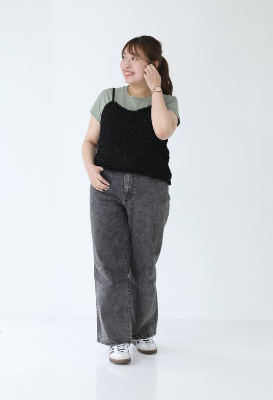 ブラックコーデに、ライトグリーンのTシャツを差し色として取り入れることで、軽やかで爽やかな印象に。キャミソールとデニムの組み合わせに、カラーTシャツがアクセントとなり、夏の日差しに映えるスタイリングに仕上がります。