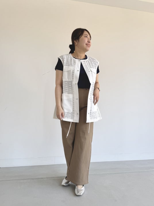 シンプルなTシャツとボトムスの組み合わせにベストをプラスするだけで、一気にこなれ感のある着こなしに。特に体型カバーをしたい方にはおすすめです!縦のラインを強調し、スタイルアップ効果も期待できます。