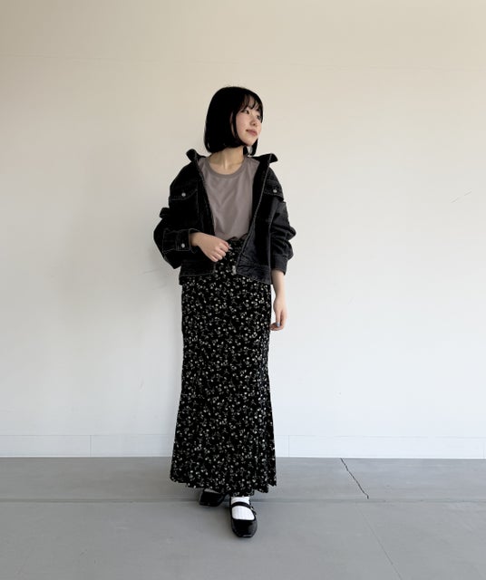 落ち着いたグレージュのTシャツに、小花柄のスカートを合わせて大人カジュアルなコーデに。グレージュは主張しすぎないカラーなので、柄物アイテムとも相性抜群。カジュアルな中にも女性らしさをプラスできます。