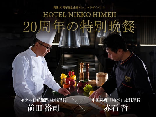 ホテル日航姫路(所在地:兵庫県姫路市、総支配人 片岡哲)では2025年6月10日(火)にホテル日航姫路 総料理長 前田 裕司と中国料理「桃李」総料理長 赤石 哲が腕をふるう、開業20周年記念企画シェフコラボイベント『20周年の特別晩餐』を開催いたします。なお、ご予約は4月10日(木)10:00より承ります。