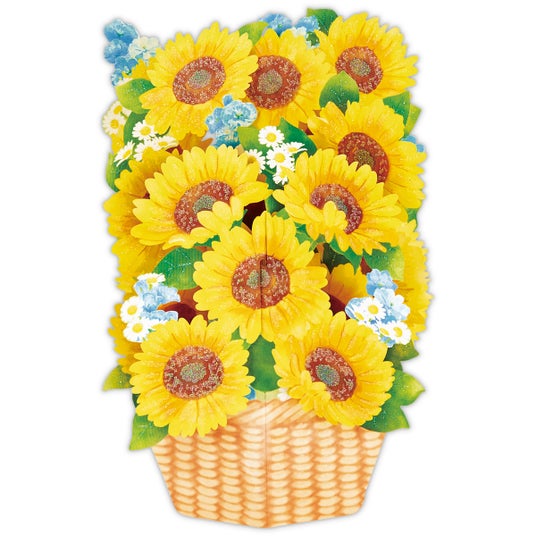 ひまわりのカードには定型内で送れるタイプが新登場。ひまわり以外に白いカモミールと青いデルフォニウムが描かれた爽やかなアレンジメントです。