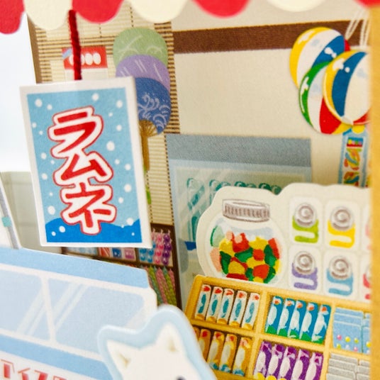 可愛らしい看板犬がお出迎えしてくれる昔懐かしい駄菓子屋を表現。紙風船や色とりどりの駄菓子、昼寝をしている猫、風車とうちわなどディテールにも注目です。