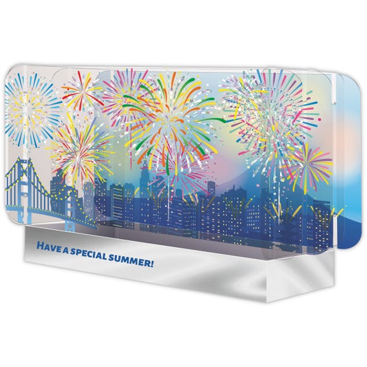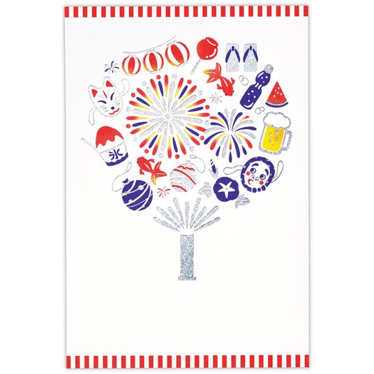 人気が高まっている花火やひまわりモチーフを拡充。花火のカードは透明素材とホログラム箔を組み合わせてきらめく夜空を表現。透明素材に描かれたビル群や花火の重なり、ちらちらと光るホログラム箔が新鮮な印象です。