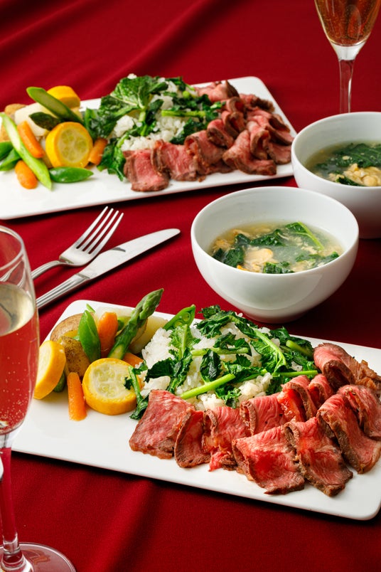 生姜の効いたローストビーフソースが肉の味わい深い旨味を引き立てます。ブロック肉でお届けするため、お好みの厚さにカットしてお召し上がりいただけます。バターソテーした5種野菜の付け合わせと、春の味覚「のらぼう菜」をふんだんに使ったバターライスとスープと一緒にいただく贅沢なセットです。