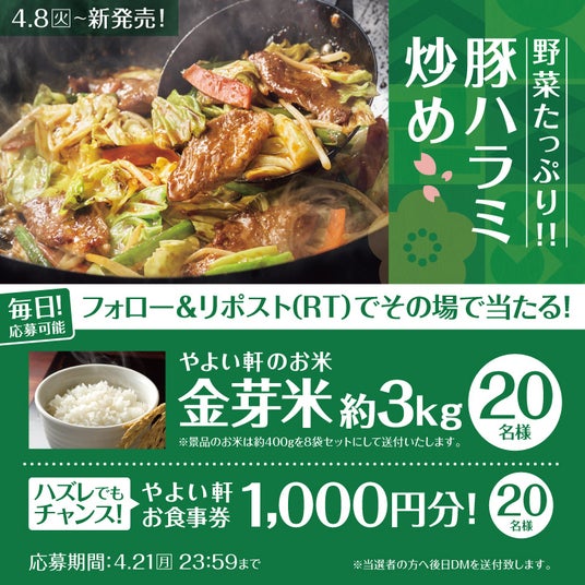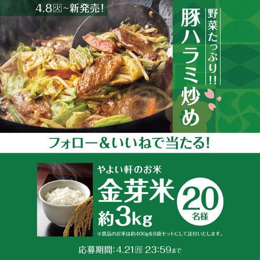 このたび日本国内の「やよい軒」では、やよい軒公式X・公式Instagramにおいて、『~ガツンとニンニク~ たっぷり野菜の豚ハラミ炒め定食』発売を記念して、おいしさだけでなく健康にもこだわった「金芽米」が当たる!キャンペーンを実施いたします。