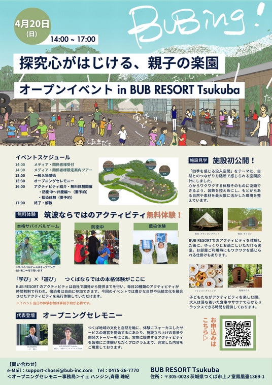 4月20日のオープンイベントでは、自然を五感で楽しめる&親子それぞれの体験に没頭できる空間設計について、メディアの皆様向けに施設見学ツアーを実施致します。取材に役立つプレスキットの配布や個別インタビューの機会もご用意し、当日の取材撮影も可能です。実際の体験の様子を取材いただきながら、BUB RESORT Tsukubaの魅力を存分にご体感ください。
