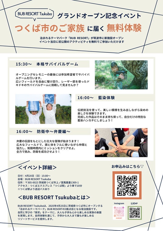 株式会社BUB(本社:東京都品川区、代表取締役:一戸 悠人)が運営する「BUB RESORT」の3拠点目となる「BUB RESORT Tsukuba」が、2025年4月25日にグランドオープンいたします。