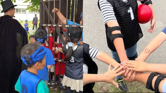 防衛中で捕まってしまった子供たち 円陣を組んで気合を入れている様子