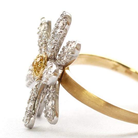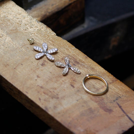 代表作は、合計約1ct、72石のダイヤモンドを敷き詰めた「ダイヤモンド K18リング・フルール」。自然物である花の可憐さを表現するため、リングの造形は4つの型(花びら2型・しべ・アーム)に分けて制作。花のパーツに合わせた地金の使い分けや、茎の質感を表現するためにアーム箇所にヤスリがけを施すなど、花の造形や質感に徹底的にこだわりました。また、宝石のセッティングには、敢えてサイズの異なる宝石をパヴェセッティング(=石畳のように隙間なく宝石を敷き詰める技法)し、花びらの造形に没入しやすい作りに。大人が身につけやすい洗練された要素を備えつつも、幼い頃に花で遊んだノスタルジーを生み出すことに、フォーカスを当てました。