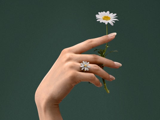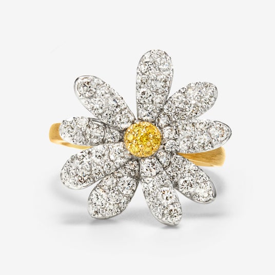 「フルール」は、綺麗な花を見つけては、指で挟んで遊んだ”あの頃”のノスタルジーを、大人が身につけられる洗練された作りで再現したパヴェリング。マーガレットを写実的に表現しながら、装飾性を抑えたディテールと、大小様々な宝石を敷き詰めることでの贅沢な輝きが特徴のジュエリーです。
