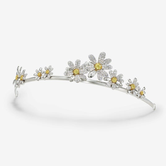 幼い頃、花畑でつくった”花冠”を表現した「ティアラ・フルール」。シルバーの地金に、計192石のダイヤモンドと、計54石のイエローサファイアを用いて仕上げています。花冠の持つ自然な立体感を再現するため、モチーフそれぞれの立体造形だけでなく、ティアラ全体で奥行きを感じられる、花と宝石のランダムな配置にこだわりました。ティアラのベースとなる部分はマットな加工を施すことで、実際に髪に装着した際に、モチーフ箇所が際立つ仕様に。アップヘアにも、ダウンヘアにも合わせやすく、スタイリングをアレンジできるので、身につけ方により表情が変わる点も特徴です。