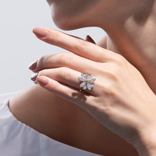 可憐な3輪の花をリングに見立てた「ダブルフィンガーリング・フルール」は、2本の指に身につけるジュエリー。計193石のダイヤモンドと、花の中央部分には計19石のイエローダイヤモンドをあしらった、ラグジュアリーなアイテムです。ランダムな花のサイズと配置、リングのアーム部分が見えづらい作りで、まるで花を指に乗せているような感覚を味わっていただけます。