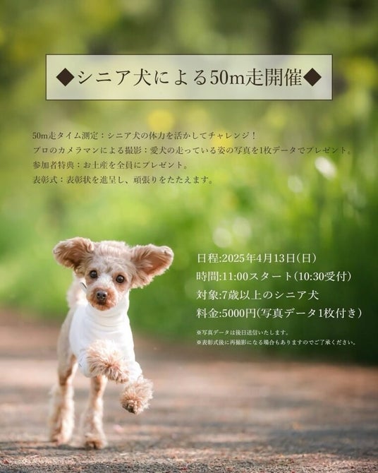 「うちの子、まだまだ元気だよ!」そんな飼い主さんの声にお応えして、7歳以上のわんちゃん限定で50m走を開催します!テーマは“記録に残そう、シニア犬の元気”。年齢を重ねてもなお輝くその走りを、ぜひこの機会に記録してみませんか?わんちゃんが一生懸命に走る姿は、見ているだけで心が温まるもの。「普段はのんびりだけど、今日はなんだかいつもと違う」そんな一瞬を、プロのカメラマン One-fr(@one_fr) がしっかりと写真に収めてくれます。撮影したお写真は後日データでお渡し。タイム計測結果も記録として残し、わんちゃんの頑張りを“数字”でもしっかりと記念に残します。さらに、タイム上位3頭には表彰状を贈呈!走った後は、みんなにお土産のプレゼントもあります