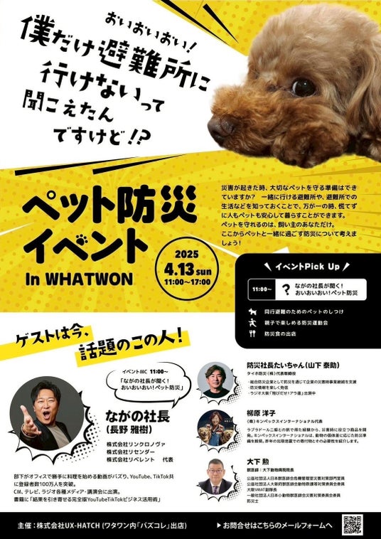 本イベントでは、ペット防災を楽しく学ぶことができます。「備えておいてよかった」と思える日が、いつかきっと来る。WHATAWONでの1日が、そのきっかけになりますように。この春、ペットとの命を守る“準備”を始めませんか?お子さまと一緒の参加も大歓迎!ぜひご家族そろってお越しください。