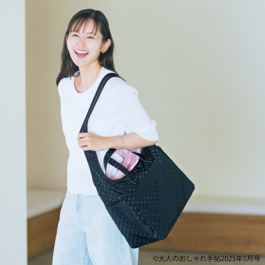 「シンプルなトートだから、ドット柄の生地で遊び心をプラスしました。 昼間はアウターを脱いでバッグにしまいたい……なんてときにも便利な大容量です」