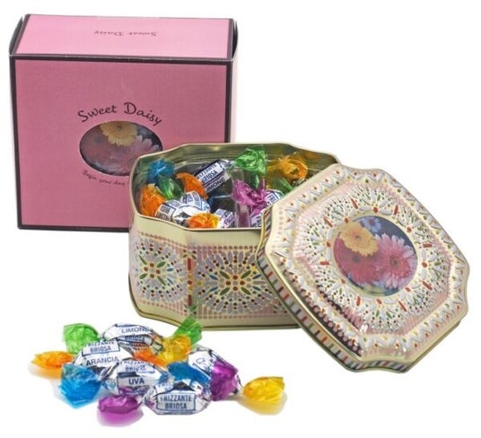 北イタリアのロナゴからやってきたキャンディ。アンティーク調の缶のなかにりんご・レモン・いちご・オレンジ・ぶどうの5つの味がアソートで入っています。