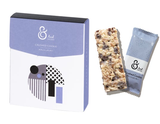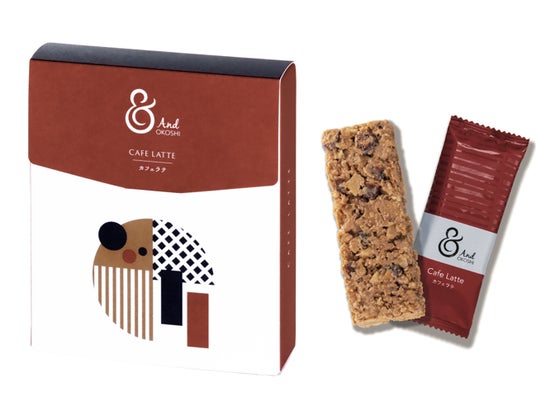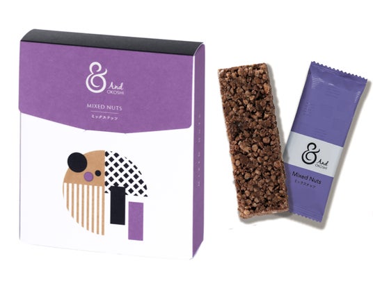 リニューアル後の単品パッケージは、スタイリッシュで気軽にシェアしやすいよう箱上部が大きく開く形状を採用、またデザインでは「& OKOSHI」の特徴である「様々な素材や食感が組み合わさってハーモニーを生み出している」イメージを、抽象的な形を組み合わせたマークで表現しています。