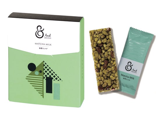 水あめをつなぎに使用した「& ORIGIN」は、昔ながらのオーソドックスな製法で作られた”歯応えのある食感”のおこしなので、背景のモチーフは「四角」に。一方、チョコレートでまとめたしっとり食感が特徴の「& NEO」では、背景のモチーフが丸になっています。また、それぞれ右下の長方形は &OKOSHIそのものを表現しています。