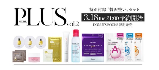 前号では、即完売した特別付録セットが、今回さらにパワーアップして登場!現品サイズが4点、サンプルサイズが4点の計8点のコスメが入った“贅沢整い”セットと、春の新作美容液下地&UVセラムと名品のヘアオイルの計3点が入った“ジルスチュアート&フローラノーティス ジルスチュアート”セットの2パターンを展開。オンラインサイト「DONUTS BOOKS」のみでご購入いただけますので、ぜひお見逃しなく!