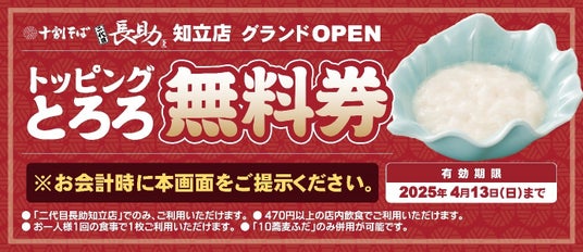 また、知立店限定でご利用いただける「トッピングとろろ無料券」を記載いたしました。この画面を掲示で期限内、何度でもご利用いただけます。