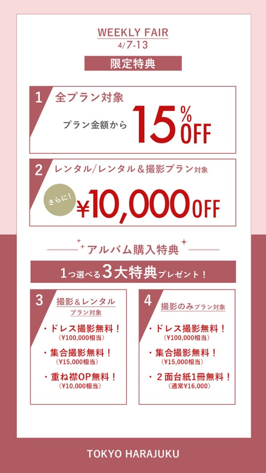 ・アルバム購入特典1.(レンタル) 選べる5大特典:ドレス1着撮影無料、集合撮影料無料、コーディネートOP半額