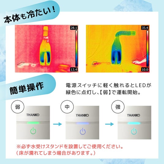 本製品は、本体内の保冷ボトルが冷やした空気を送り出すスポット扇風機です。