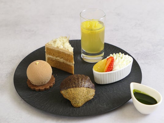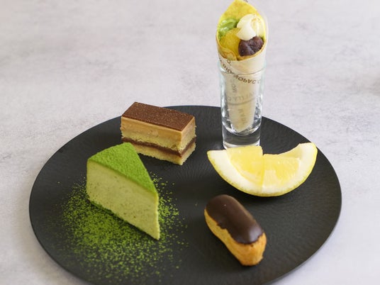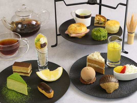 日本国内有数のお茶どころである静岡県。その静岡県が誇る「抹茶」、ほうじ茶」、和紅茶「べにふうき」「緑茶」と季節の柑橘である甘夏「スルガエレガンス」や「伊豆ニューサマーオレンジ」をアクセントにした合計10種のスイーツと4種のセイヴォリーをご用意いたしました。