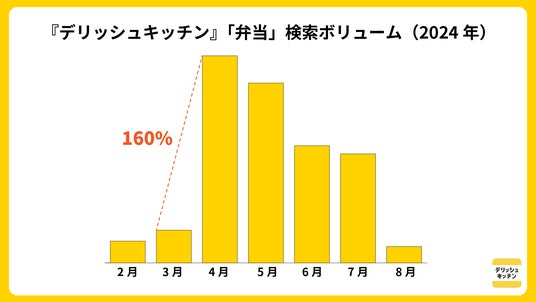 『デリッシュキッチン』では、例年4月~7月頃をピークに「弁当」の検索ボリュームが急上昇します。2024年は、4月の「弁当」検索が前月比160%になりました。この時期は行楽シーズンで運動会などのイベントも多く、普段はお弁当を作らない方も持ち歩く機会が多くなるタイミングでもあります。
