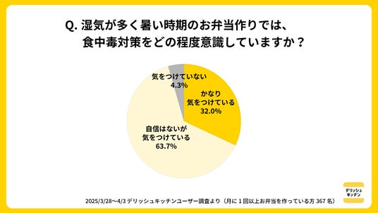 「湿気が多く暑い時期のお弁当作りでは、食中毒対策をどの程度意識しているか」という質問に対して「かなり気をつけている」と回答した方は、32%に留まる結果に。63.7%が「自信はないが気をつけている」、4.3%が「気をつけていない」と回答しました。