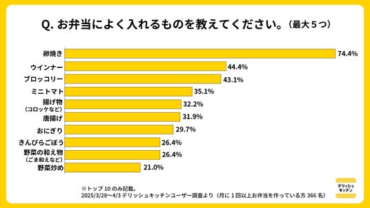続いて、お弁当によく入れるものを伺うと、トップ3は「卵焼き」(74.4%)、「ウインナー」(44.4%)、「ブロッコリー」(43.1%)でした。また、トップ10内にはミニトマトやおにぎり、野菜の和え物など、特に梅雨や夏場に要注意なおかずが並んでいることが分かりました。
