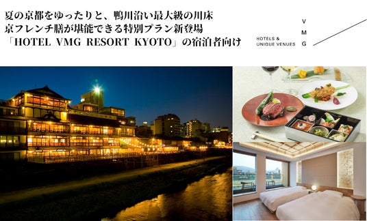 バリューマネジメント株式会社(本社:大阪府大阪市、代表:他力野 淳)が展開する「VMG HOTELS & UNIQUE VENUES」(以下、当グループ)の京都の分散型ホテル「HOTEL VMG RESORT KYOTO」(京都府京都市、以下、当ホテル)は、「了以棟」宿泊者向けの川床特別プランを販売いたしますのでお知らせします。本プランでは、当グループのユニークべニューであり鴨川沿い最大級の川床を有する「鮒鶴京都鴨川リゾート」(京都府京都市、以下、当ユニークべニュー)にて京フレンチ膳のフルコースディナーがお愉しみいただける内容となっております。