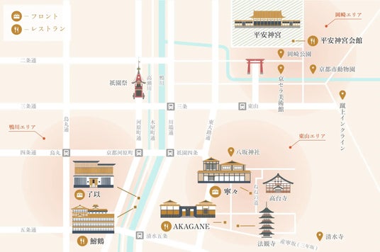 当ホテルは “まだ見ぬ時と出会う場所”をコンセプトに歴史的建造物を利活用する「VMG HOTELS & UNIQUE VENUES」として、京都市に開業した分散型ホテルです。鴨川、東山、岡崎という3つのエリアに点在する文化財や名勝、歴史的建造物を活用したレストランや宿泊棟などを見るだけではなく利用することで、より深く京都の文化に触れる体験を提供します。