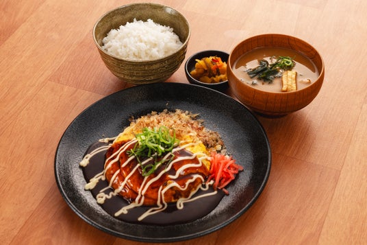 豚バラ肉と焼きそばを入れたドーム型のオムレツで、モチモチ麺とふわとろ玉子の食感が楽しめます♪