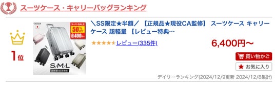 楽天市場ランキング(デイリー・スーツケース・キャリーバッグ部門)で1位(2024年12月9日)を獲得した際のスクリーンショット