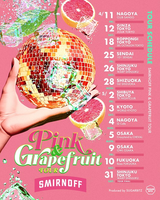 発売に伴い全国12カ所のナイトクラブで実施する「SMIRNOFF PINK & GRAPEFRUIT TOUR」を4月11日(金)より開催いたします。アーティストSloppy Diskによるタイアップ・ソング「Pink Grapefruit feat. Grace Aimi」の初披露などを行います。