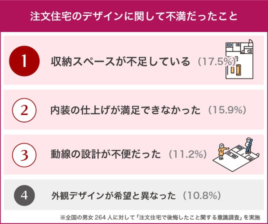 しかし、デザインにこだわりすぎると、住み始めてから不満が出てくることも少なくありません。今回のアンケートでは、不動産会社が提案したデザインについて、どのような点に後悔があるかを調査しました。