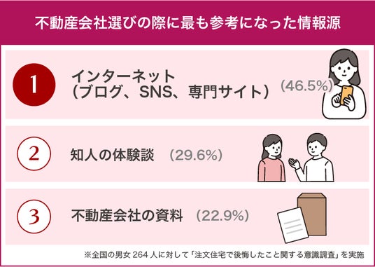 今回のアンケートでは、注文住宅を建てる際に、最も参考になった情報源として、「インターネット(ブログ、SNS、専門サイト)」が46.5%で1位となりました。近年、インターネットを通じてさまざまな情報を手軽に入手できるようになったことが、この結果に繋がっていると考えられます。