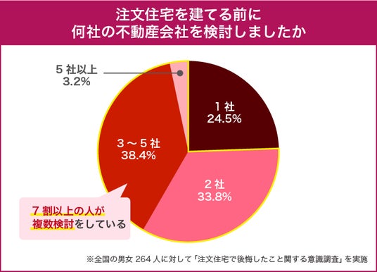 今回のアンケートでは、不動産会社選びの際に、何社の不動産会社を検討したかについて調査しました。その結果、7割以上の人が複数の会社を検討していることが明らかになりました。