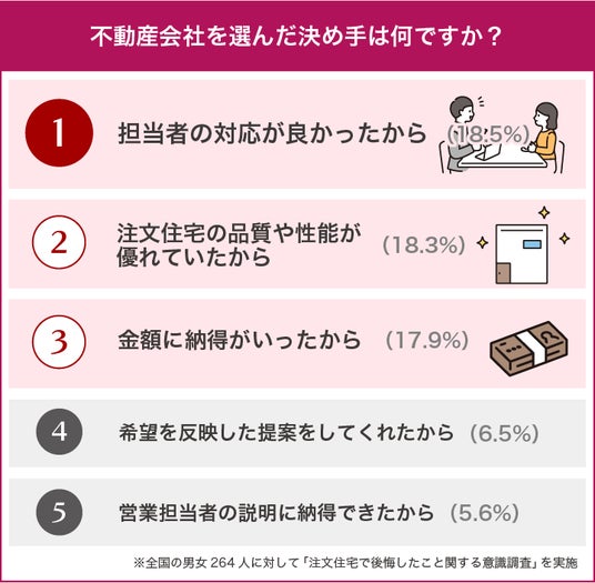 これらの結果から、不動産会社選びにおいては、金額だけでなく担当者の対応や住宅の品質、性能といった要素も重視されていることがわかります。