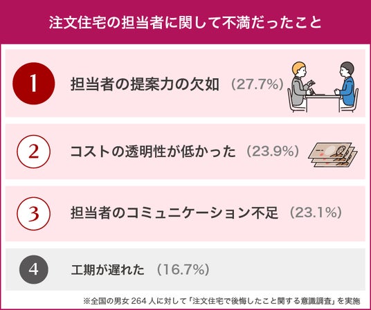 注文住宅の建築において、不動産会社の担当者は、顧客の夢を形にするための重要なパートナーです。しかし、担当者の質によっては、コスト面だけでなく、さまざまな不満が生じる可能性があります。今回のアンケートでは、担当者への不満に関する調査も行いました。