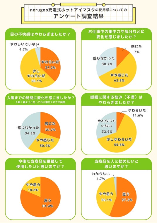 調査方法:対象者にnerugoo充電式ホットアイマスクを提供し、使用後にオンラインアンケートにて使用感について回答を収集