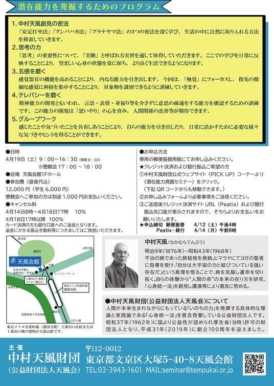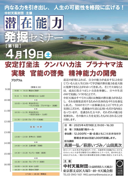公益財団法人天風会(所在地:東京都文京区/理事長:山田真次/通称名:中村天風財団/以下、当会)は、2025年4月19日(土)・6月21日(土)・10月11日(土)・2026年1月17日(土)・2月14日(土)・3月7日(土)の全6回で、潜在能力の引き出し方を身につけるための「1日セミナーシリーズ」を開催いたします。参加費は12,000~30,000円/回です。