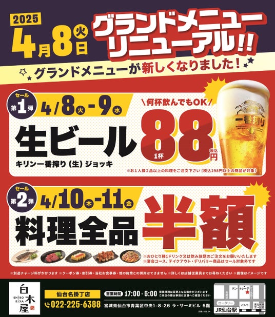 「白木屋 仙台名掛丁店」では、グランドメニューリニューアルを記念したセールを開催いたします!