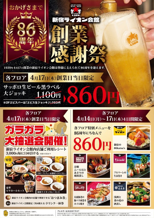 新宿でビールを楽しむなら『新宿ライオン会館』86周年記念の感謝祭イベントを4/14~4/17に開催