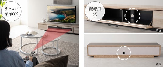 背面に配線穴を設けて配線をすっきり整理。コード類が乱雑にならず、見た目も美しいです。