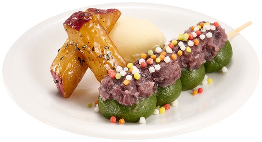 「老舗茶舗のお抹茶団子盛り合わせ」は、抹茶団子、大学いも、バニラアイスのボリューム満点の盛り合わせです。抹茶団子は、抹茶の風味を生かすため、一番茶と二番茶をブレンドした「森半」の宇治抹茶を使用し、色と風味を損なわないようにこだわりの製法で作り上げました。甘さ控えめであずきの風味が感じられるように仕立てた粒あんとの相性も抜群で、トッピングの五色あられが見た目のアクセントになっています。