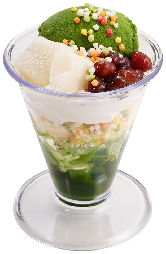 また、「老舗茶舗のいろどりお抹茶パフェ」は、「森半」の宇治抹茶を使用した本格派和テイストのパフェです。一番茶を丁寧に挽いた「森半」の宇治抹茶を、抹茶蜜と抹茶アイスに使用しました。主役の森半抹茶アイスと抹茶蜜に、つるっとした喉ごしの寒天風ゼリー、コシと柔らかな食感が楽しめる小粒の求肥、北海道産の大納言ゆであずきを合わせました。さらに、バニラアイスとホイップ、仕上げの五色あられで彩り豊かで贅沢なパフェに仕上げました。抹茶本来の奥深い香りとコク、上品さを引き立てる緻密な味のバランスを存分にお楽しみください。