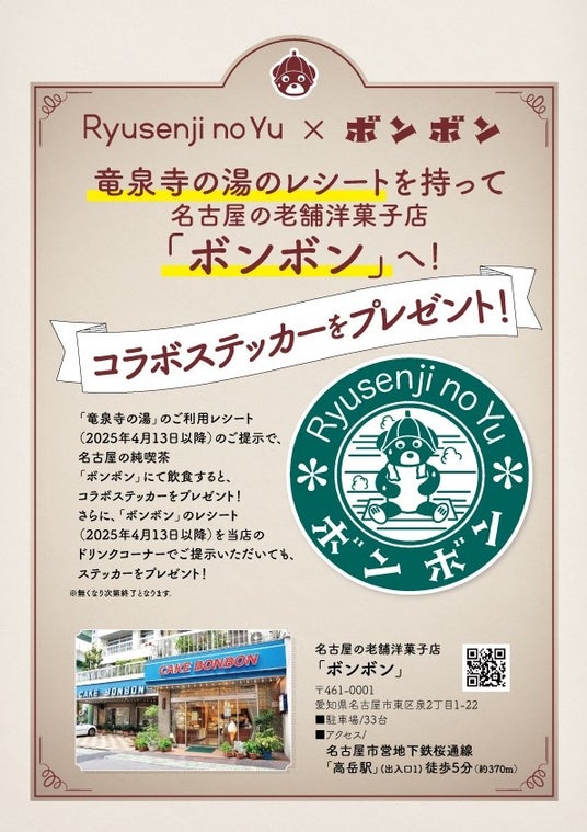 スーパー銭湯発祥の温浴施設「竜泉寺の湯」を運営するオークランド観光開発株式会社(本社:愛知県春日井市、代表取締役:松永 明子)は、「喫茶店の日」を記念して、名古屋の老舗純喫茶「洋菓子・喫茶 ボンボン」とのコラボレーションを4月13日(日)よりスタートします。ビームスディレクターズバンク監修のコラボグッズ(数量限定)や洋菓子・喫茶 ボンボン監修のフードの販売と合わせてコラボイベントを開催します。被り物姿のくまのキャラクターを使用したグッズの展開や初監修のフード、ドリンクが登場!この貴重な機会を是非お見逃しなく!